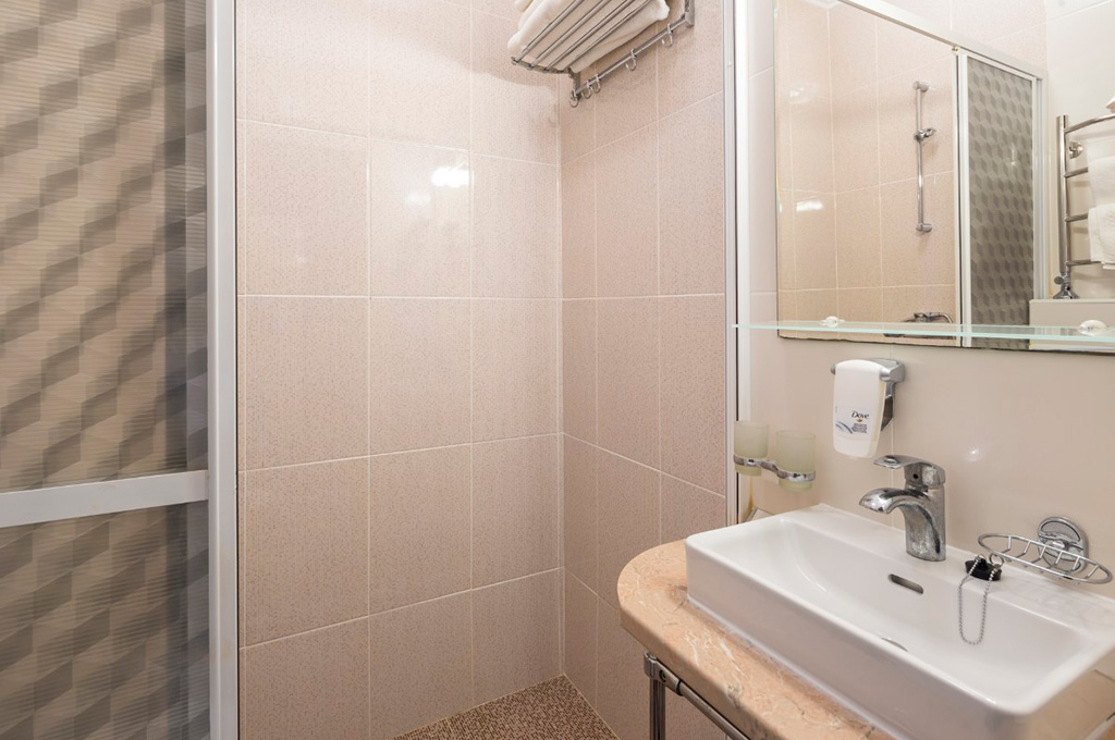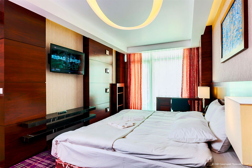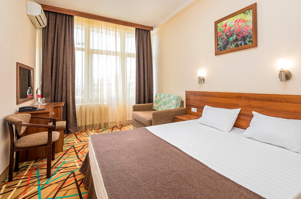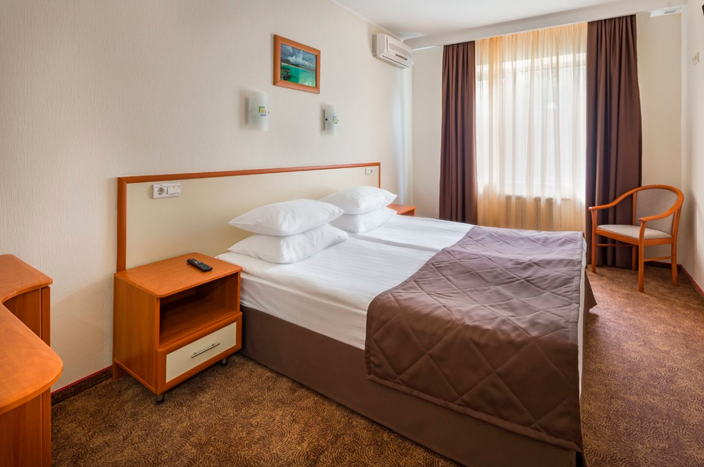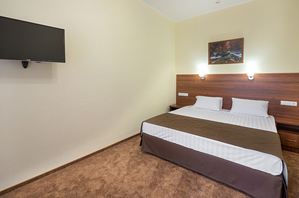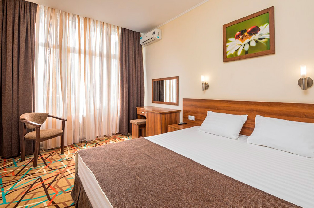 В номере: двуспальная кровать, сплит-система, мини-холодильник, телевизор, телефон, мини-сейф, фен, полный санузел.