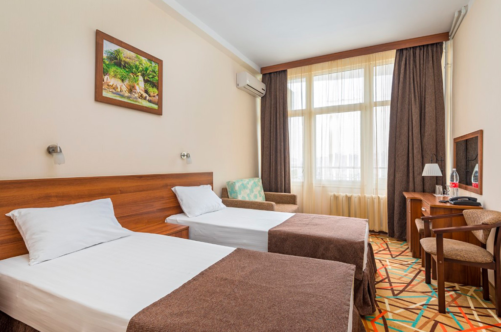 В номере: двуспальная кровать/2 односпальные кровати, сплит-система, мини-холодильник, телевизор, телефон, мини-сейф, фен, полный санузел.