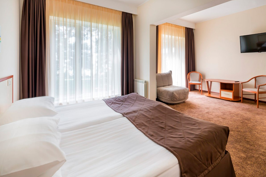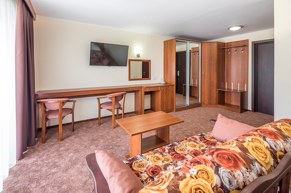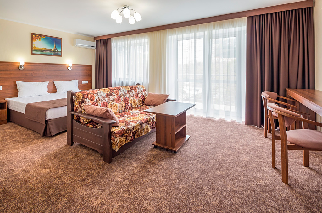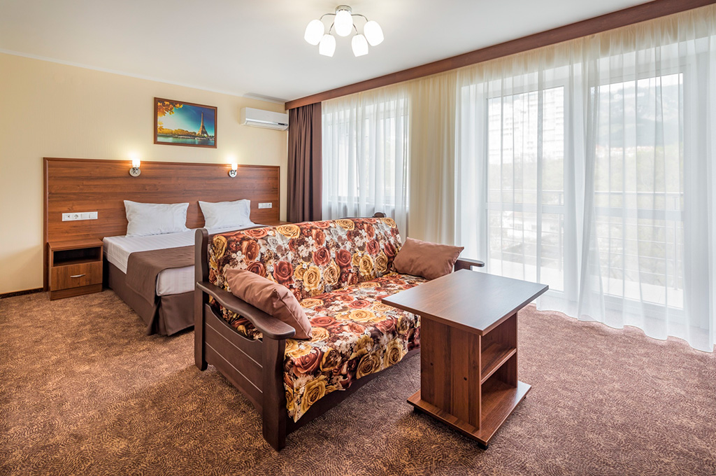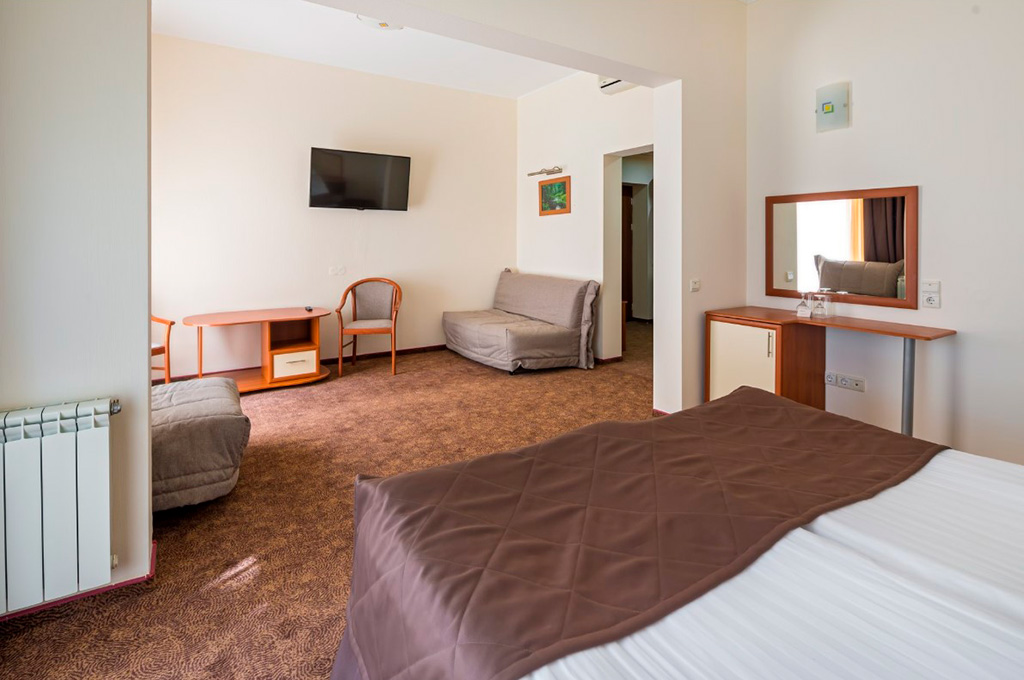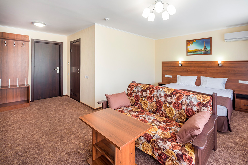 В номере: французская кровать, диван, сплит-система, мини-холодильник, телевизор, фен, полный санузел.