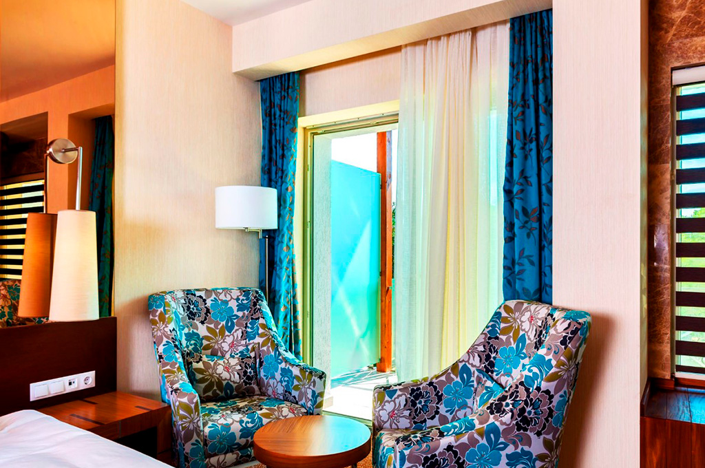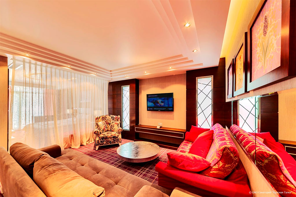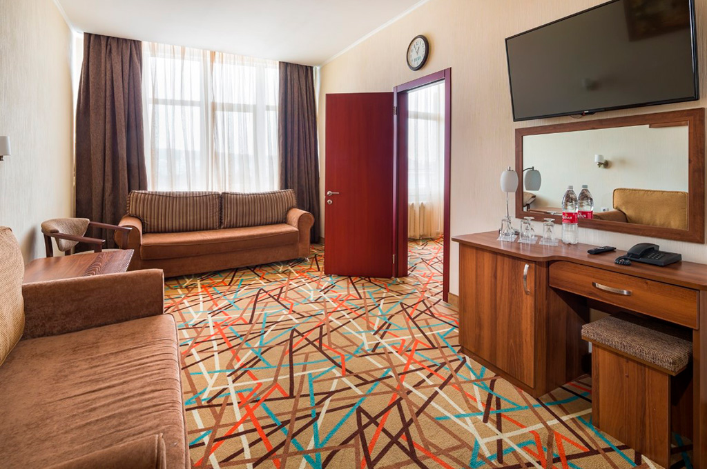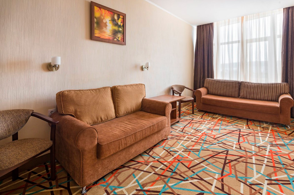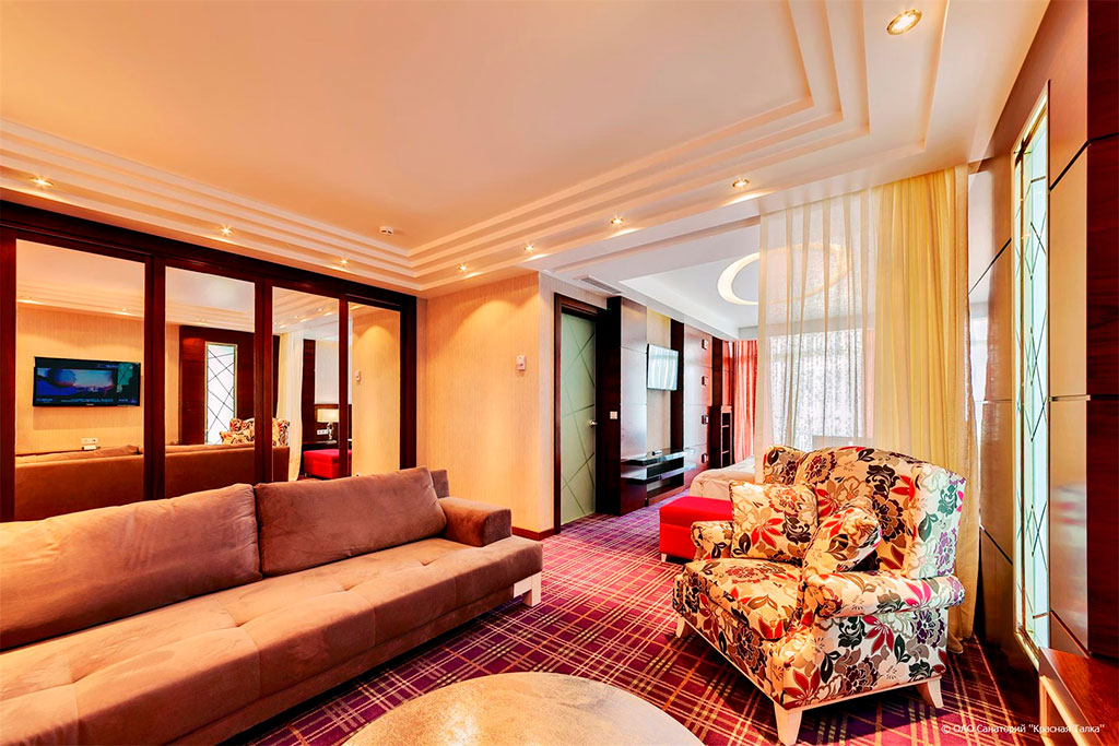 В номере: кровать двуспальная, набор мягкой мебели, прикроватные тумбочки, столик журнальный, столик туалетный, стулья, шкаф-купе, зеркало, ковровое покрытие, кресла, мини-холодильник, сейф, сплит-система, телевизор ЖК, телефон. Ванная комната: ванна и душевая кабина, тапочки, туалетные принадлежности, фен, халат.
