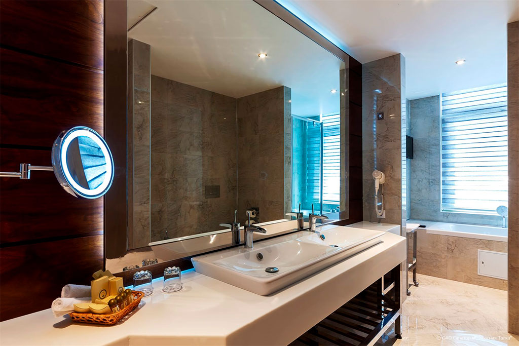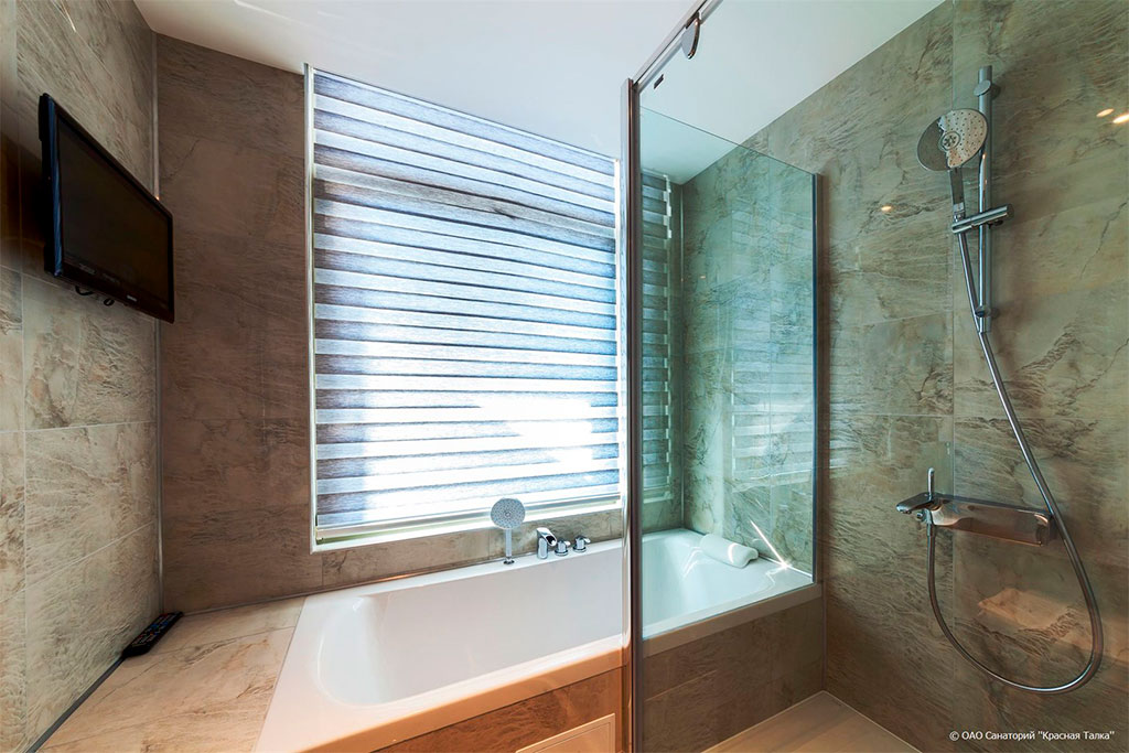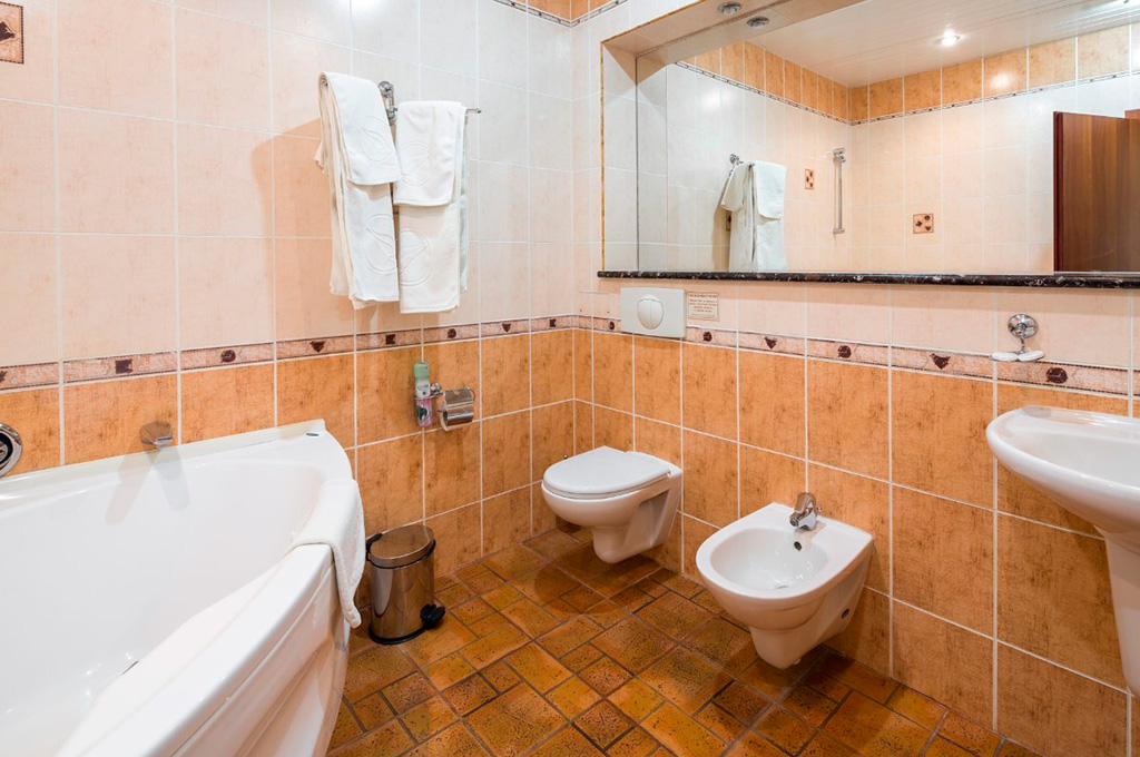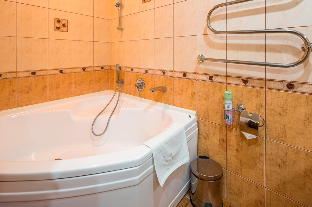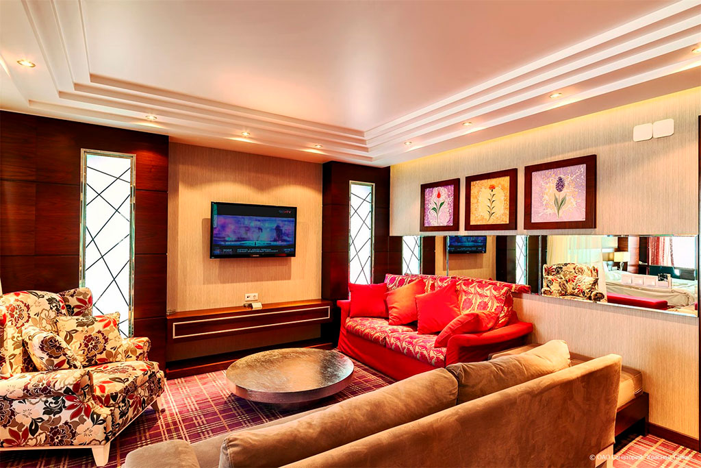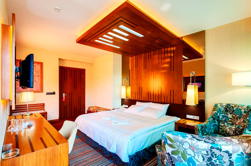 В номере: кровать двуспальная, набор мягкой мебели, прикроватные тумбочки, столик журнальный, столик туалетный, стулья, шкаф-купе, зеркало, ковровое покрытие, кресла, мини-холодильник, сейф, сплит-система, телевизор ЖК, телефон. Ванная комната: ванна и душевая кабина, тапочки, туалетные принадлежности, фен, халат.