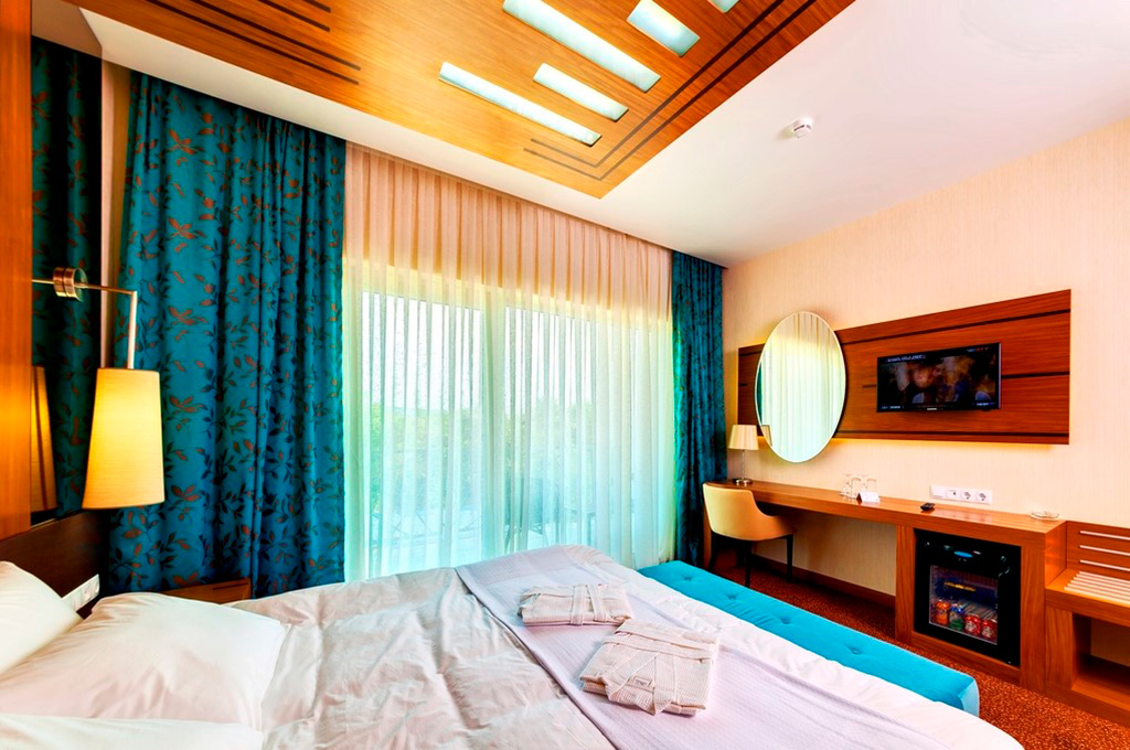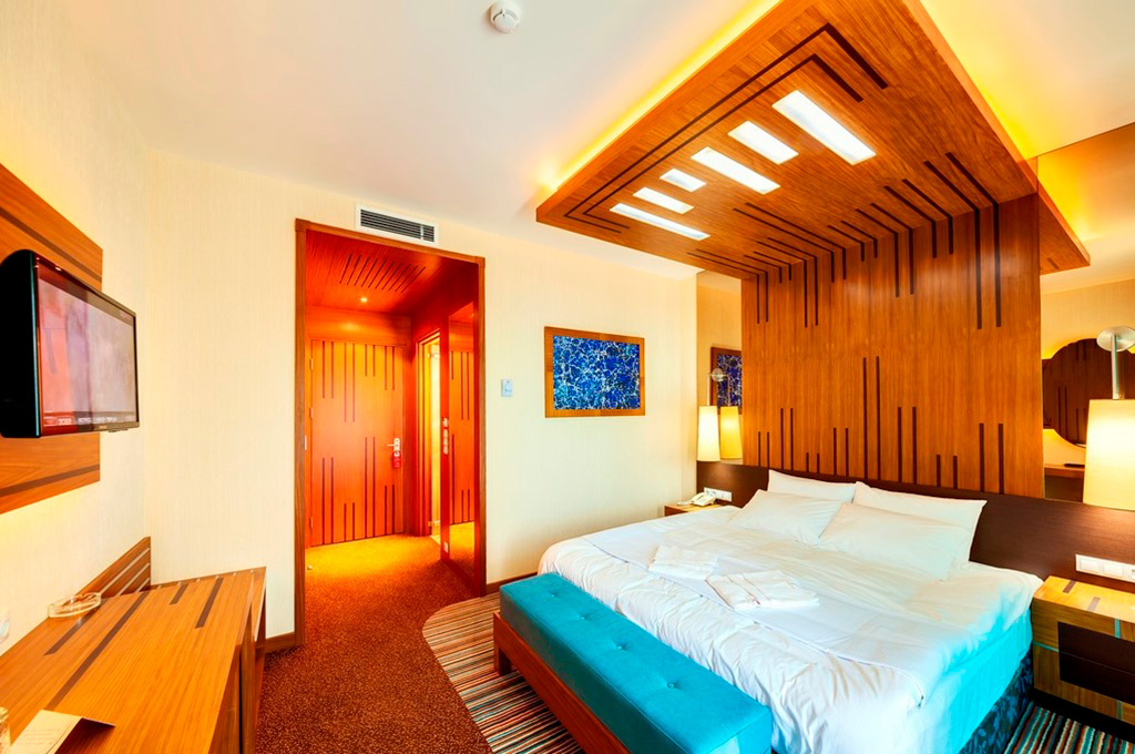 В номере: двуспальная кровать, сплит-система, мини-бар (не заполняемый), телевизор, мини-сейф, фен, полный санузел.