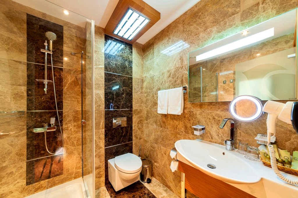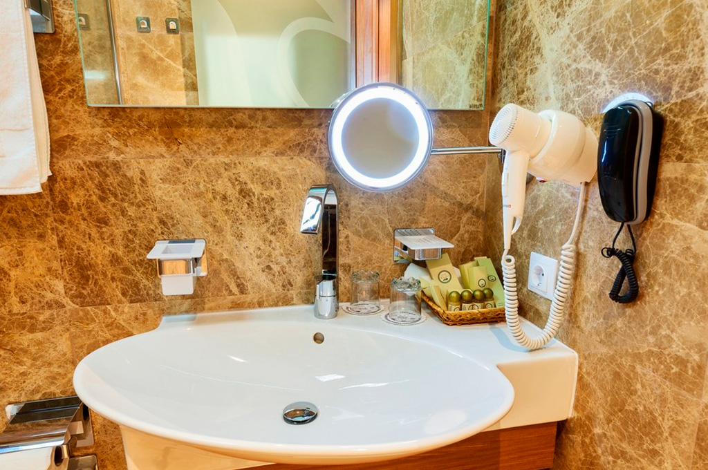 В номере: французская кровать, кондиционер, мини-бар (без алкогольных напитков), телевизор, телефон, мини-сейф. В ванной комнате: душевая кабина, фен, полотенца, туалетные принадлежности.