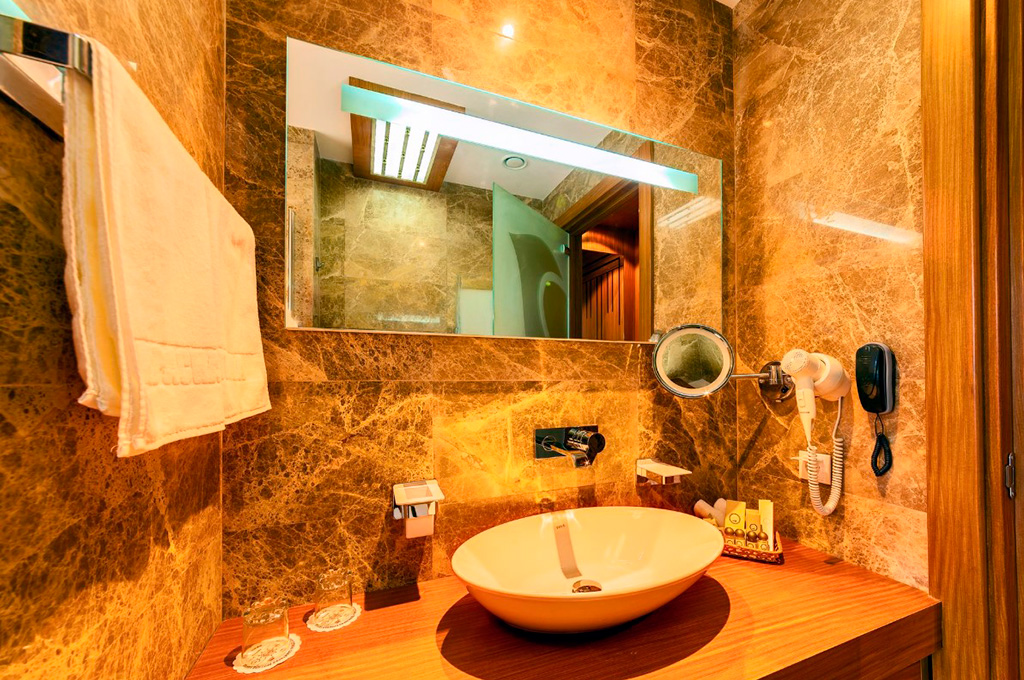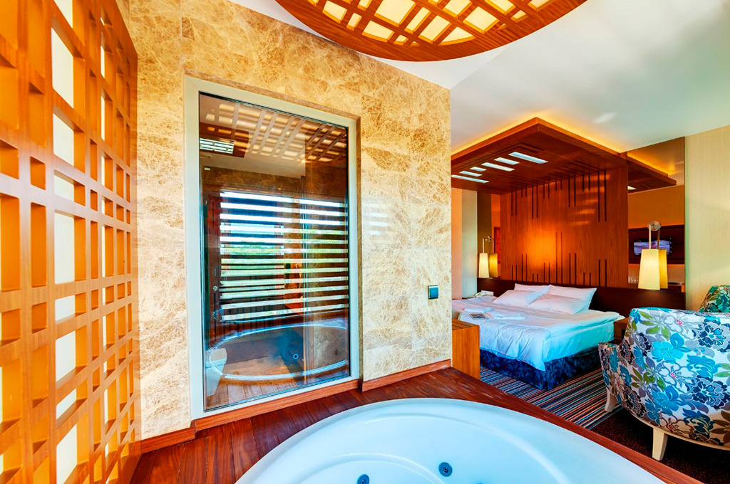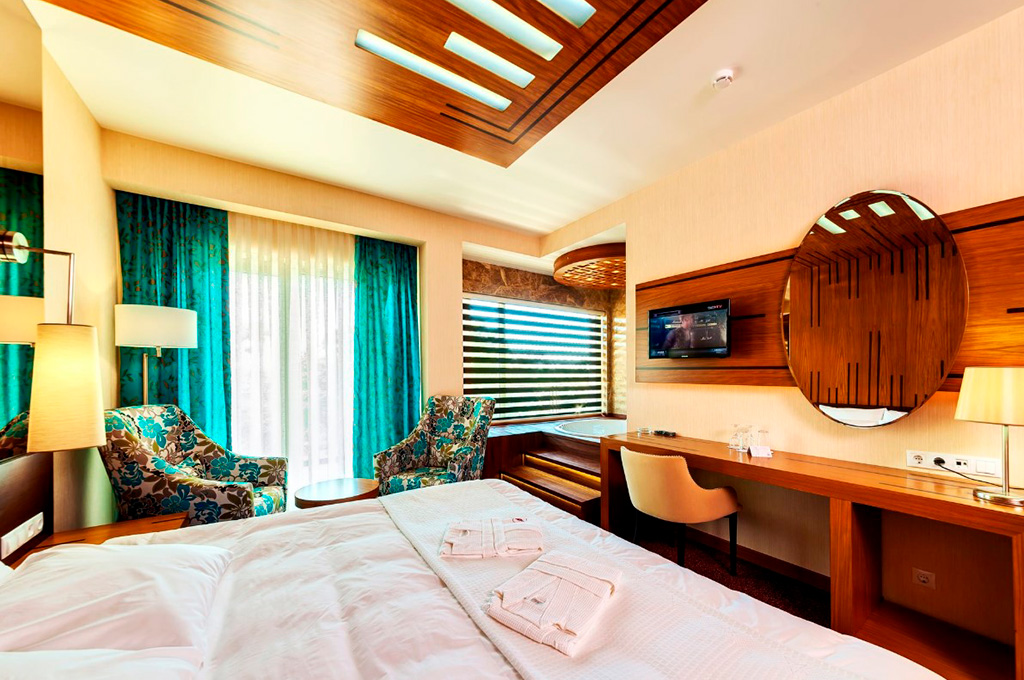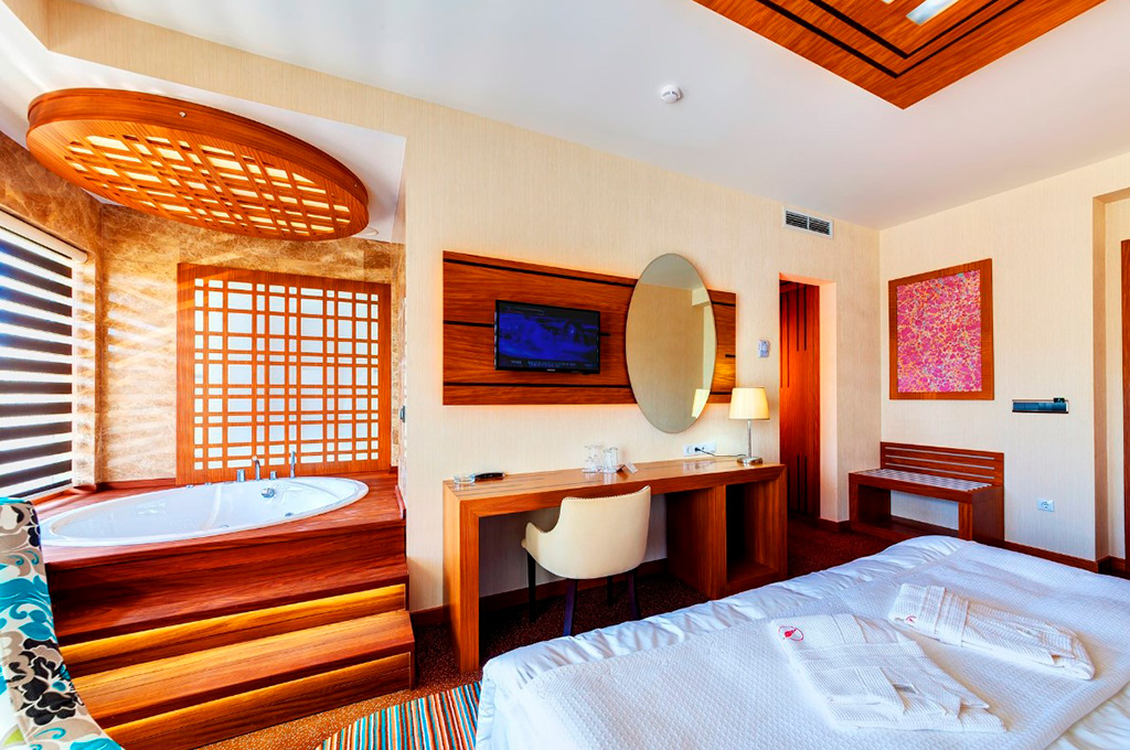В номере: французская кровать, кондиционер, мини-бар (без алкогольных напитков), телевизор, телефон, мини-сейф. В ванной комнате: душевая кабина, джакузи с видом на море, фен, полотенца, туалетные принадлежности.